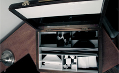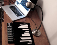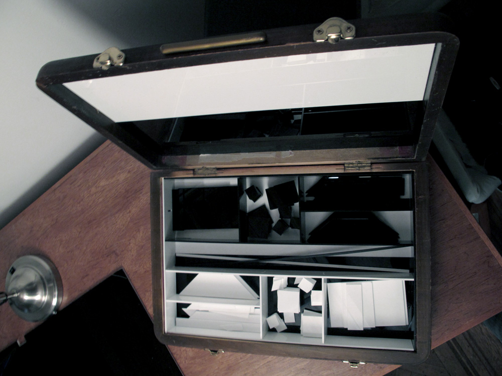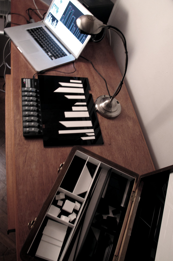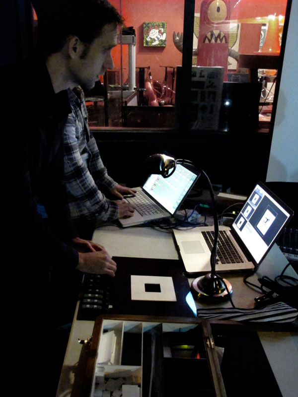 The physical set up for temporary cities consists of an antique box filled with specially design plexiglass shapes, a retrofitted LED lamp custom fit with a firewire camera, a korg usb midi controller, a laptop, and custom software written in openFrameworks.