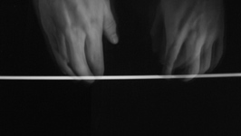 The performer hand places shapes beneath a video camera.